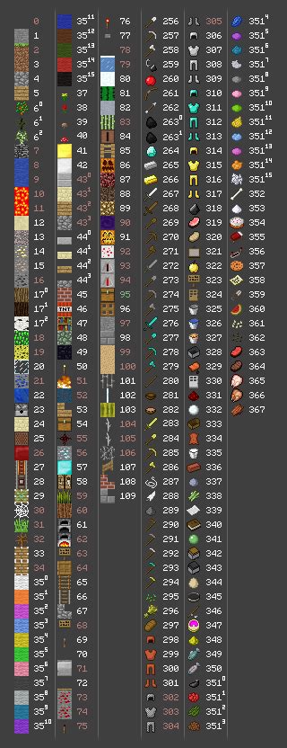 Spawning items allows you to obtain items without miningharvesting them. Every Item and Block has its own unique Item ID. You can spawn items in a singleplayer game if you enabled the "Enable Cheats" option when you created your world.